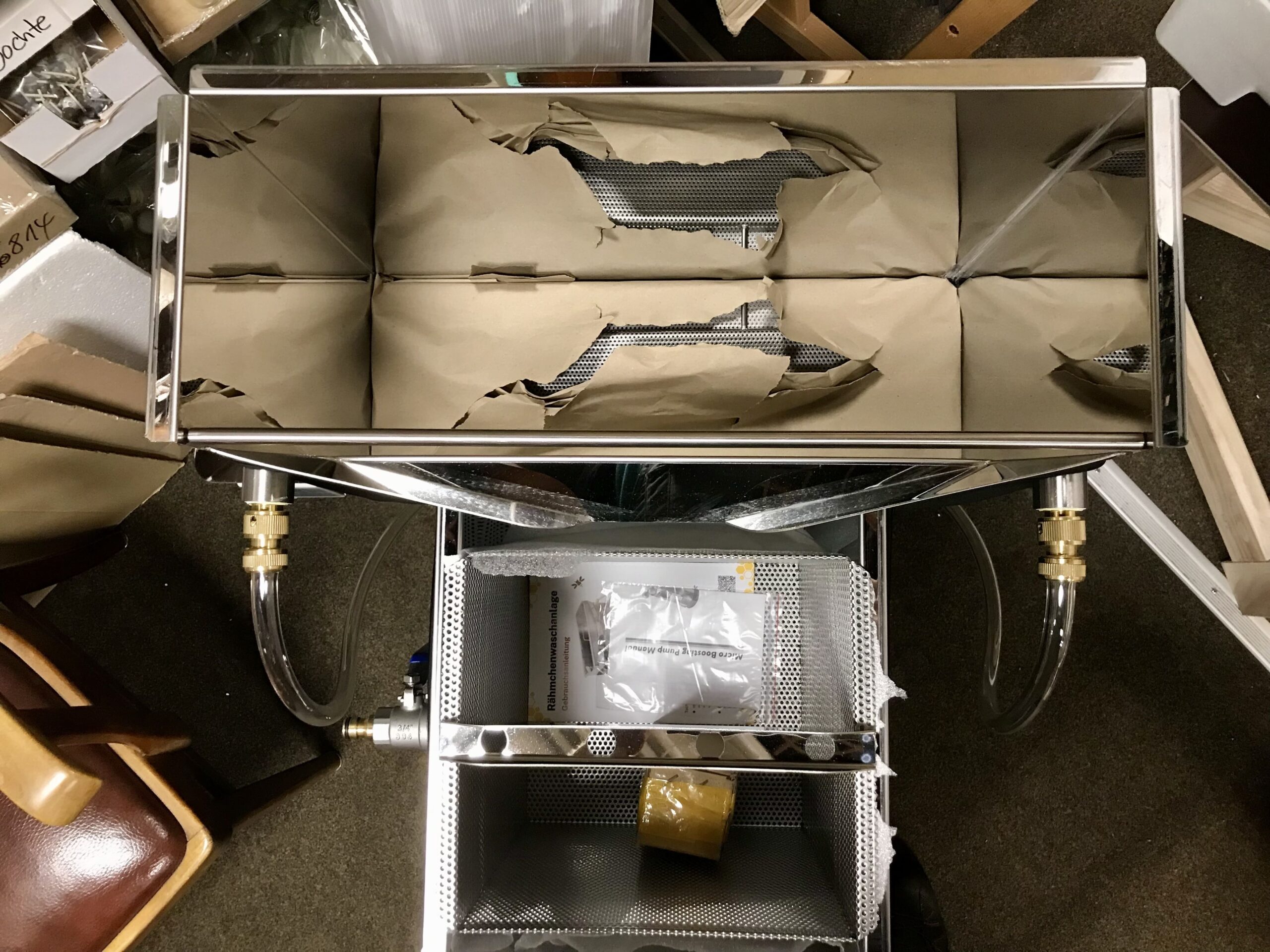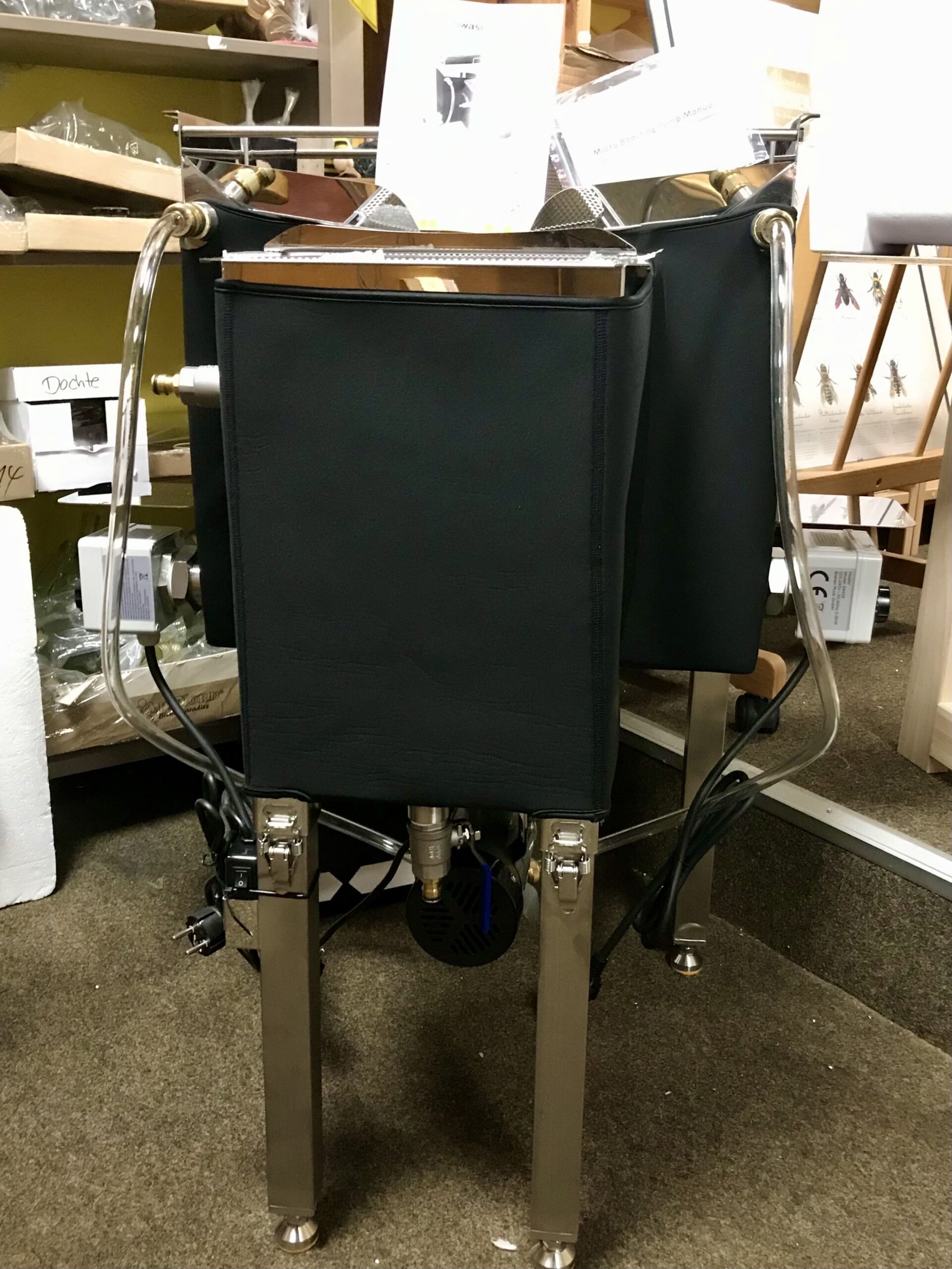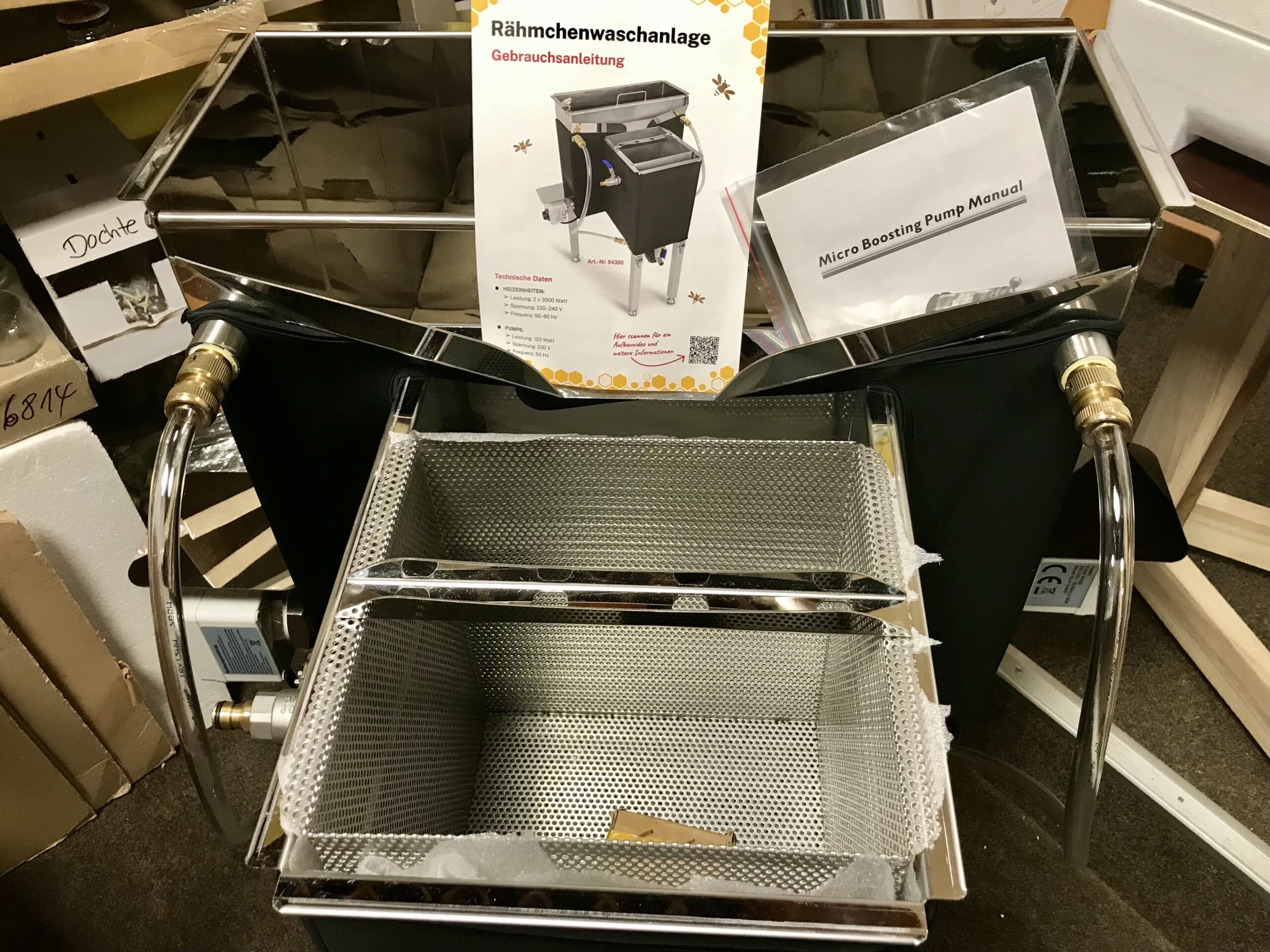 Die Wachsschmelz- und Rähmchenwaschanlage vereint zwei Arbeitsschritte in einem Gerät: Das Schmelzen von Wachs und das Waschen der Rähmchen und flachen Beutenteile. Das innovative Konzept dieser einzigartigen Anlage, entwickelt von Ralf Kolbe, bietet eine praktische Lösung und erleichtert die imkerlichen Arbeiten.